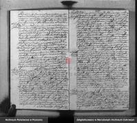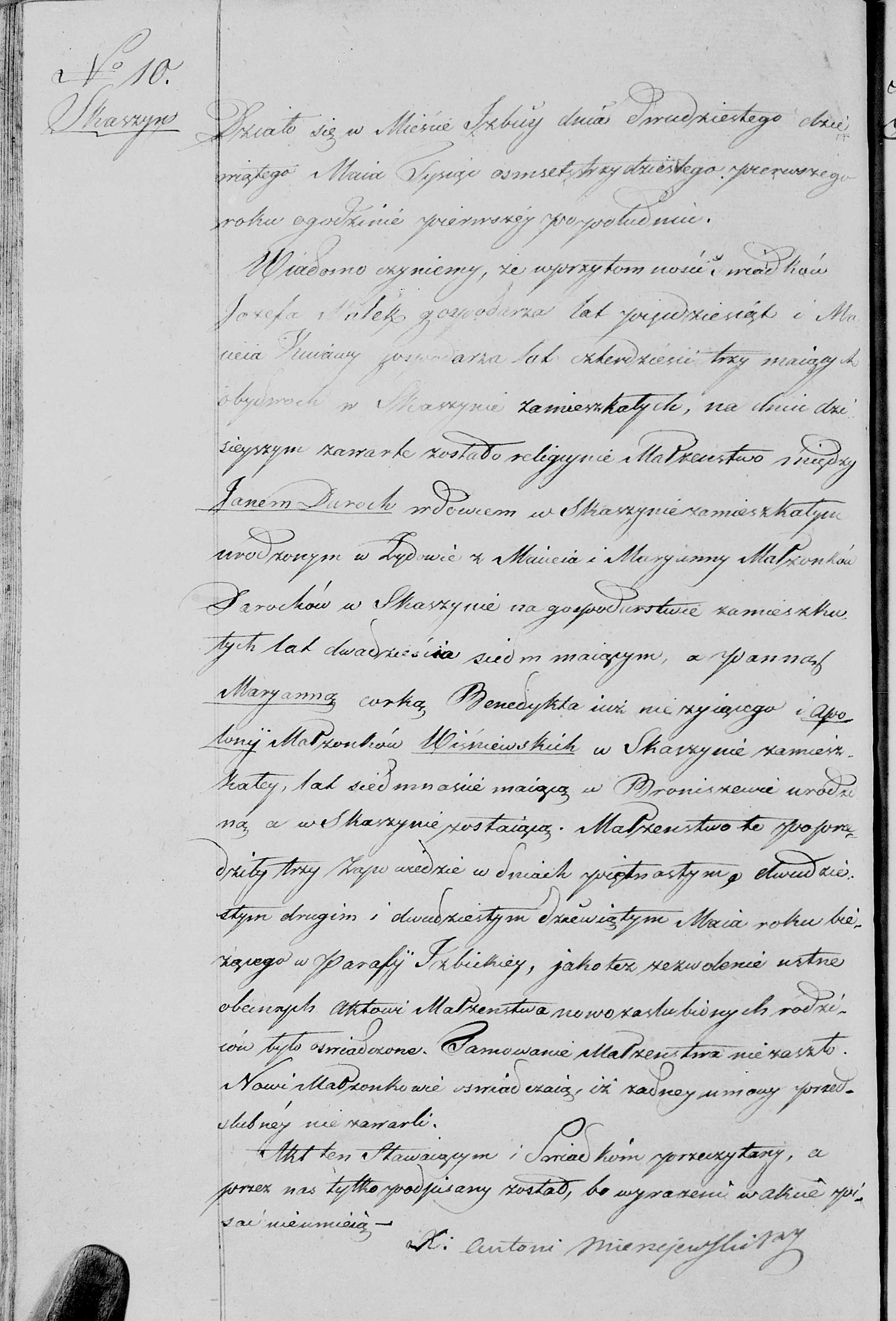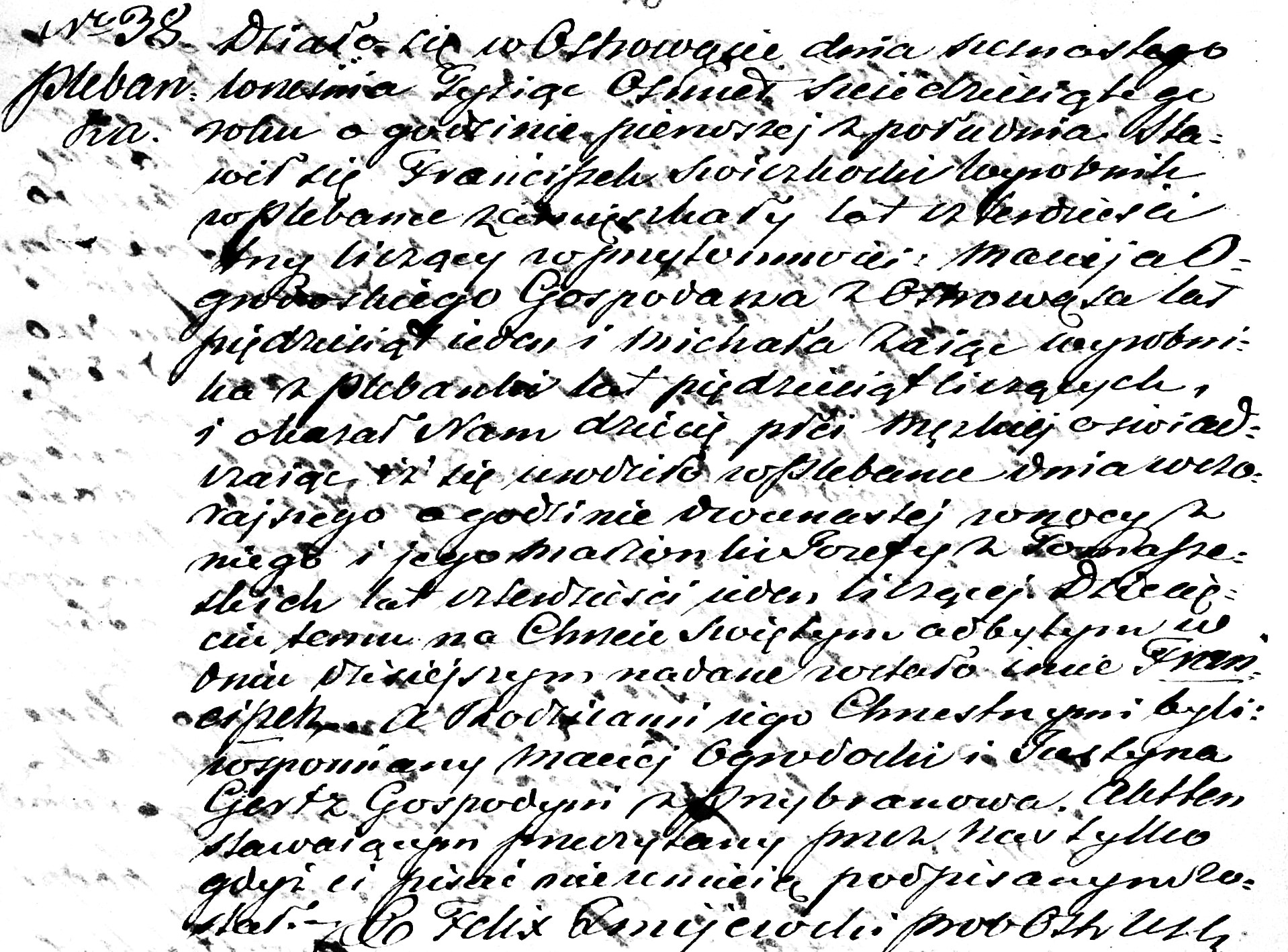 "Am siebzehnten / neunundzwanzigsten Januar, im Jahr achtzehnhundertsiebenundfünfzig [??], um sechs Uhr abends, in Ostrowas, verkünden wir, dass in Anwesenheit der Zeugen: Matzey Koezoletski, fünfundvierzig Jahre alt, Bauer und Landwirt, wohnhaft in Stavkah [?], und Matum Shymchak [?], sechzig Jahre alt, Landwirt aus Ostrowas, an diesem Tag eine religiöse Ehe zwischen Franciczek Swieczkowski / … Sohn des verstorbenen Francziscek und Jozefa, geborene Tomaszewska, aus Sukrugov Evokvleih [?], geboren im Dorf Plebanka [?], wohnhaft in Stavkah [?] bei seiner Mutter, einundzwanzig Jahre alt, und Michalina Zablocka Jungfrau, Tochter von Anton und Jozefa, geborene Przeździęk , aus Ratsyonok[?], wohnhaft in Surovonle[?], Tochter eines achtzehnjährigen Landwirts [?], geschlossen wurde. Dieser Ehe gingen drei öffentliche Bekanntmachungen in den Pfarrkirchen hier, in Sestrovochmim [?],und auch in Spevskim[?], am dritten / fünfzehnten / zehnten / neunundzwanzigsten und siebzehnten / neunundzwanzigsten Januar des laufenden Jahres voraus. Das Ehepaar erklärt, dass keine vorherige Ehevereinbarung getroffen wurde. Die Zustimmung der Eltern des Bräutigams und der Braut wurde beim Eheakt erklärt. Die religiöse Trauung wurde von uns, dem unterzeichnenden Pfarrer der örtlichen Gemeinde, durchgeführt. Dieser Akt wurde den Anwesenden, darunter den Zeugen, vorgelesen und anschließend von uns unterzeichnet. Ko. Panteleimon Olkovich, Pfarrer."