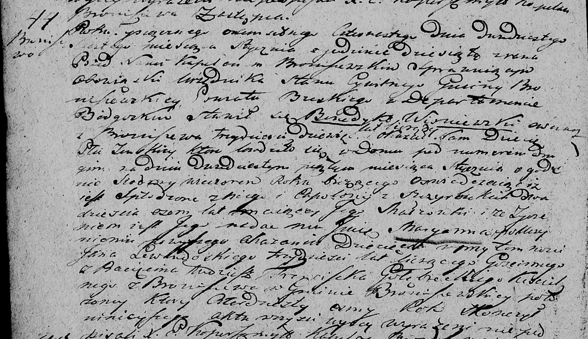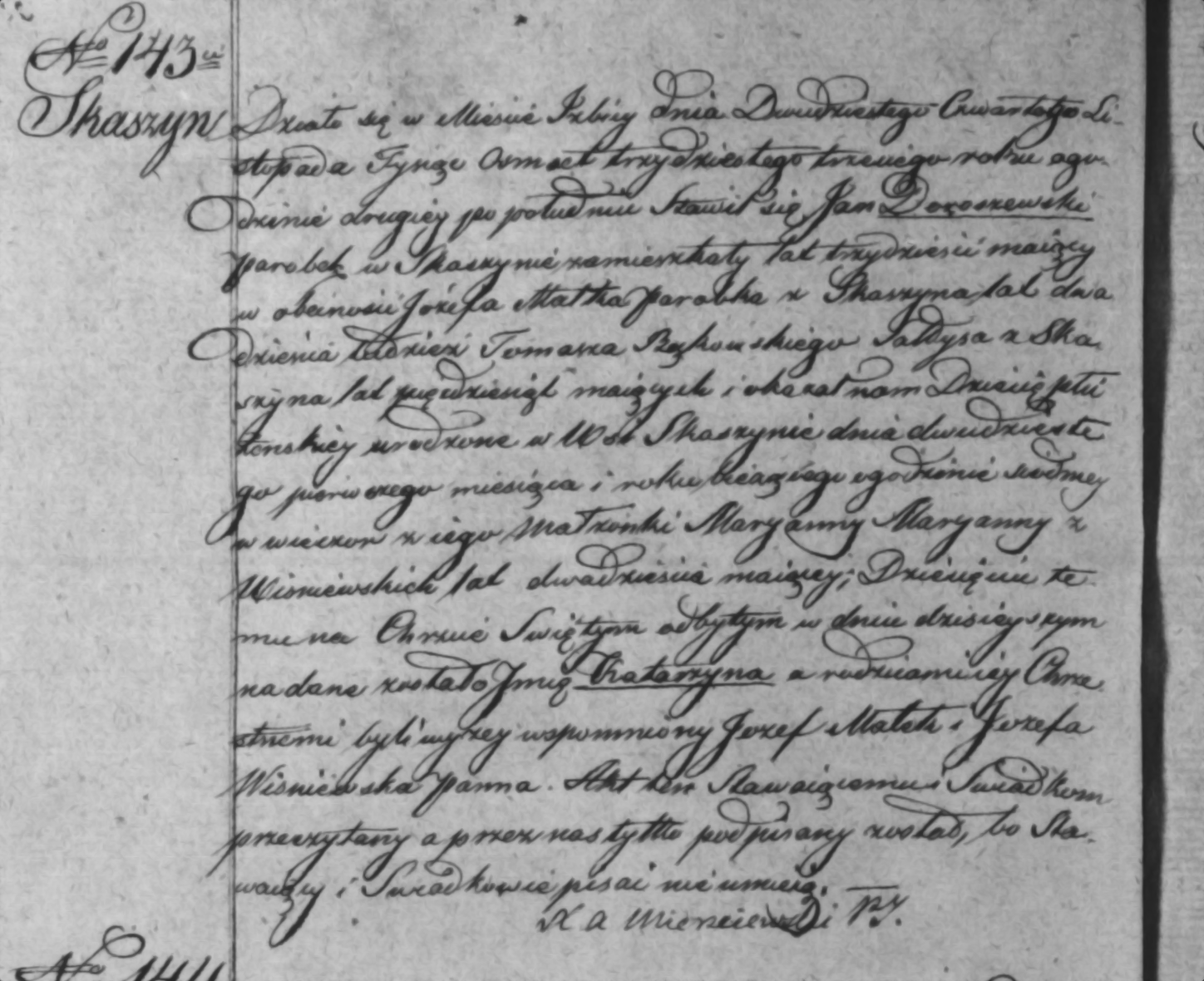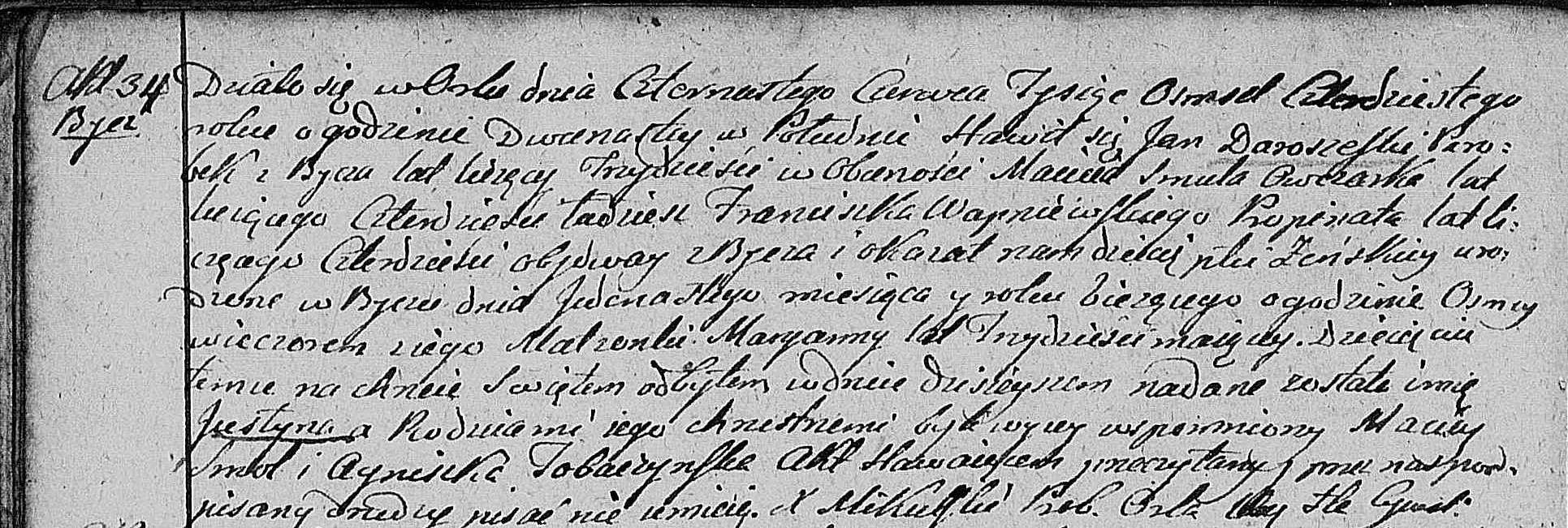 Es geschah in Raciążek am zweiundzwanzigsten September des Jahres Tausendachthundertsechzigdrei um neun Uhr morgens. Erschienen ist Antoni Zabłocki, Bewohner von Raciążek, vierundzwanzig Jahre alt, in Anwesenheit von Stanisław Imćki, einundvierzig Jahre alt, und Winsen Nowakowski, sechsunddreißig Jahre alt, beide Bürger von Raciążek. Sie zeigten uns ein weibliches Kind, geboren in Raciążek am zweiundzwanzigsten Tag dieses Monats um drei Uhr nachmittags, und erklärten, dass es von ihm und seiner Ehefrau Jozefa geb. Przezdzięgi, einundzwanzig Jahre alt, stammt. Dieses Kind erhielt bei der heutigen Taufe den Namen Michalina. Die Taufpaten waren der wohlhabende Stanisław Iwielici und die Marganna Noakamska.