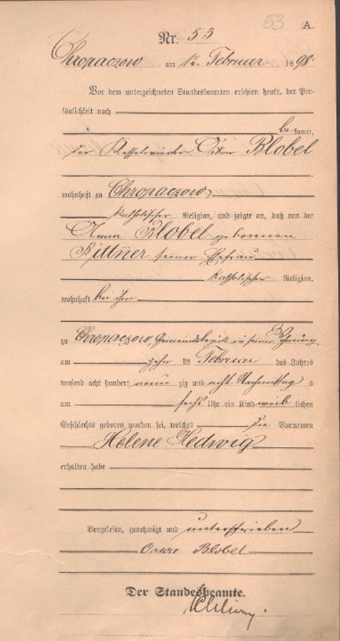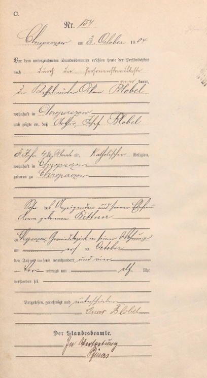 Carl Blobel am 15 November 1868 in Jaschkowitz bei Zawada / Polen.