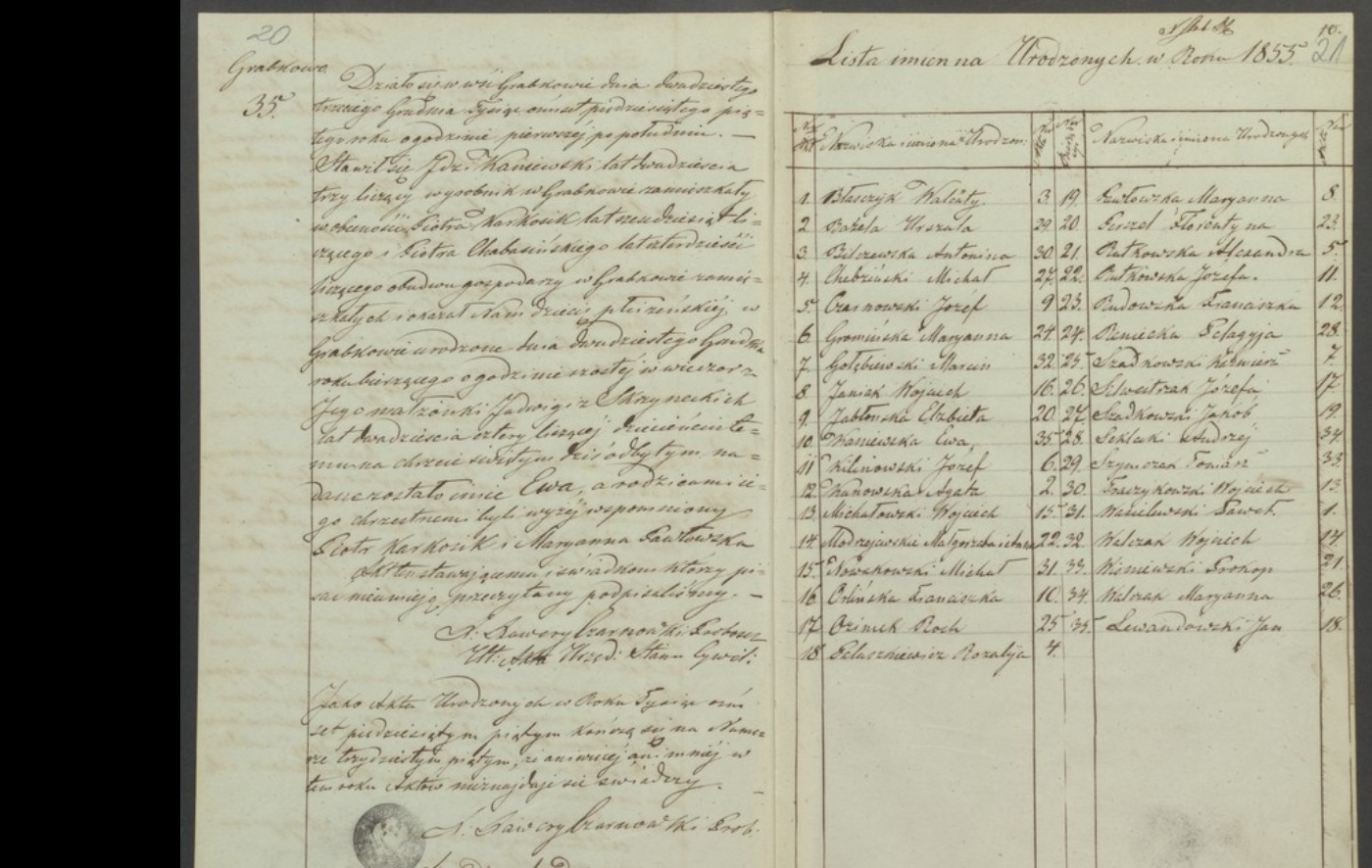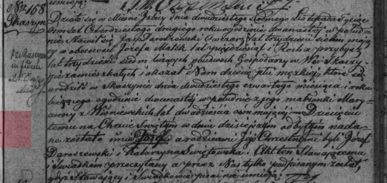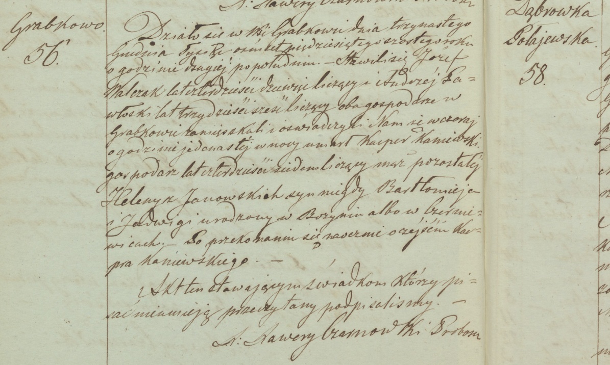 Es geschah in Świerczyn am vierzehnten Mai des Jahres eintausend achthundert einundzwanzig um zehn Uhr morgens. Es erschienen Boleslaw Darosewski, vierunddreißig Jahre alt, und Piotr Frysa, dreißig Jahre alt, beide wohnhaft in Mialki, und erklärten, dass am gestrigen Tage, im laufenden Monat und Jahr, um sechs Uhr abends in Mialki Władysław Jan Daroszewski, fünf Jahre alt, gestorben sei, geboren in Ronferd Ohio in Amerika, wohnhaft in Mialki, Sohn von Bolezlaw und Stanisława geborene Swieczkowska, Ehefrau Darozewski, Gutsbesitzer. Nach der persönlichen Überzeugung über den Tod von Władysław Jan Darozewski wurde dieser Akt den anwesenden, die nicht schreiben können, vorgelesen und nur von uns unterschrieben.