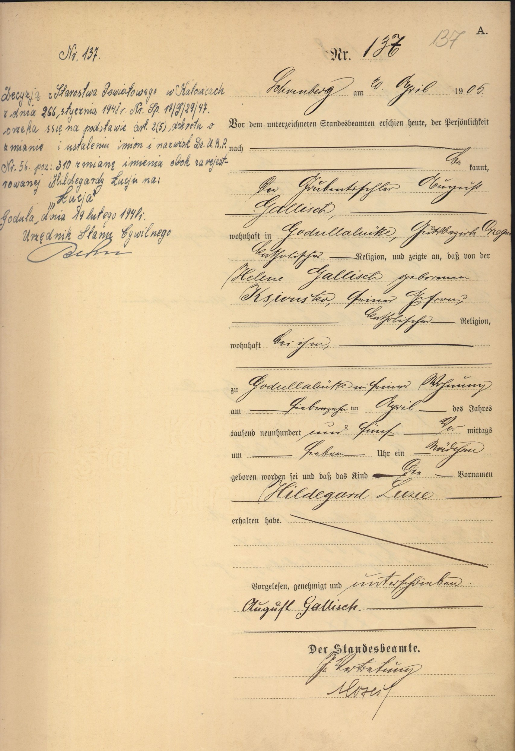 Hildegard Luzie Galisch wurde am 17 April 1905 in Godullahütte, Gutsbezirg Orzegow, geboren.