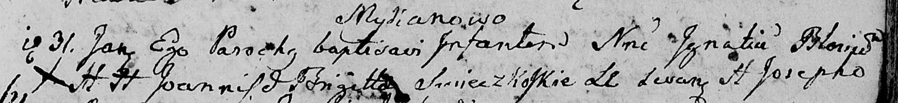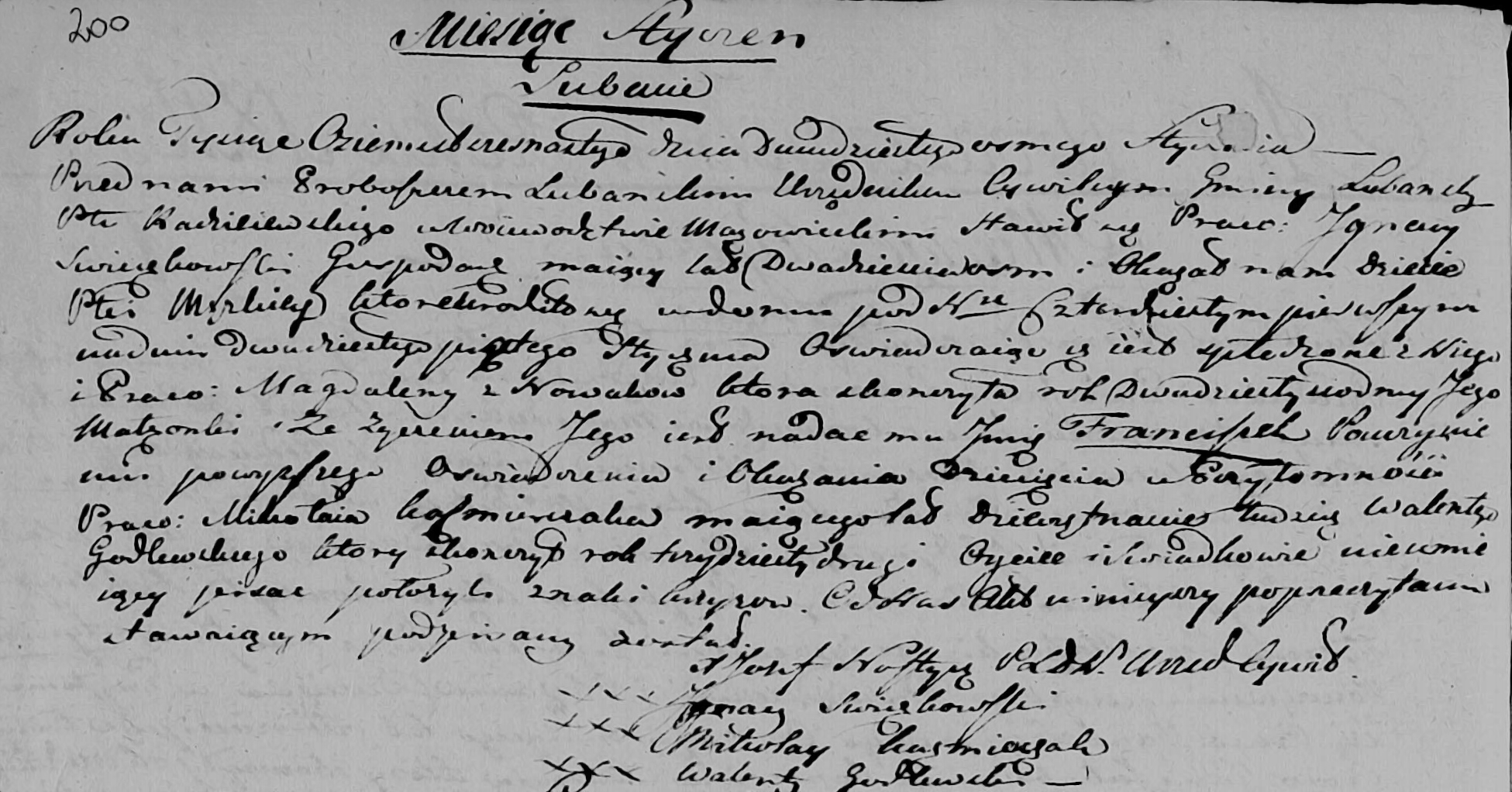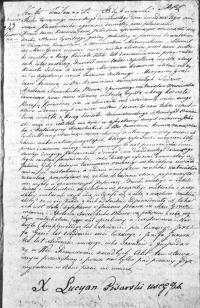 Im Jahr Tausend achthundert sechzehn am achtundzwanzigsten Tag des Monats Januar erschien vor uns, dem Pfarrer von Lubanie dem Zivilbeamten von Lubanie in der Provinz Radzieiowskie, Woiwodschaft Masowien, der Herr Ignacy Swieczkowski, Gastwirt, im Alter von achtundzwanzig Jahren, und seine Frau []ein männliches Kind, das zu Hause unter der Adresse Nummer 40 [Haus Nummer 40?] ersten am fünfundzwanzigsten Tag des Monats Januar geboren wurde, erklärte, dass es von ihm und seiner Frau Magdalena Nowaków gezeugt wurde, die im siebenundzwanzigsten Lebensjahr steht. Sein Wunsch ist es, ihm den Namen Franciszek zu geben. Nach dieser Erklärung und Vorlage des Kindes anwesend waren Herr Mikołaj, neunzehn Jahre alt, sowie Walenta Godlewski, der sein zweiunddreißigstes Lebensjahr vollendet hat. Der Vater und die Zeugen, die nicht schreiben können, legten Kreuzzeichen ab. Die vorliegende Erklärung wurde von den oben genannten gelesen, genehmigt und unterschrieben.