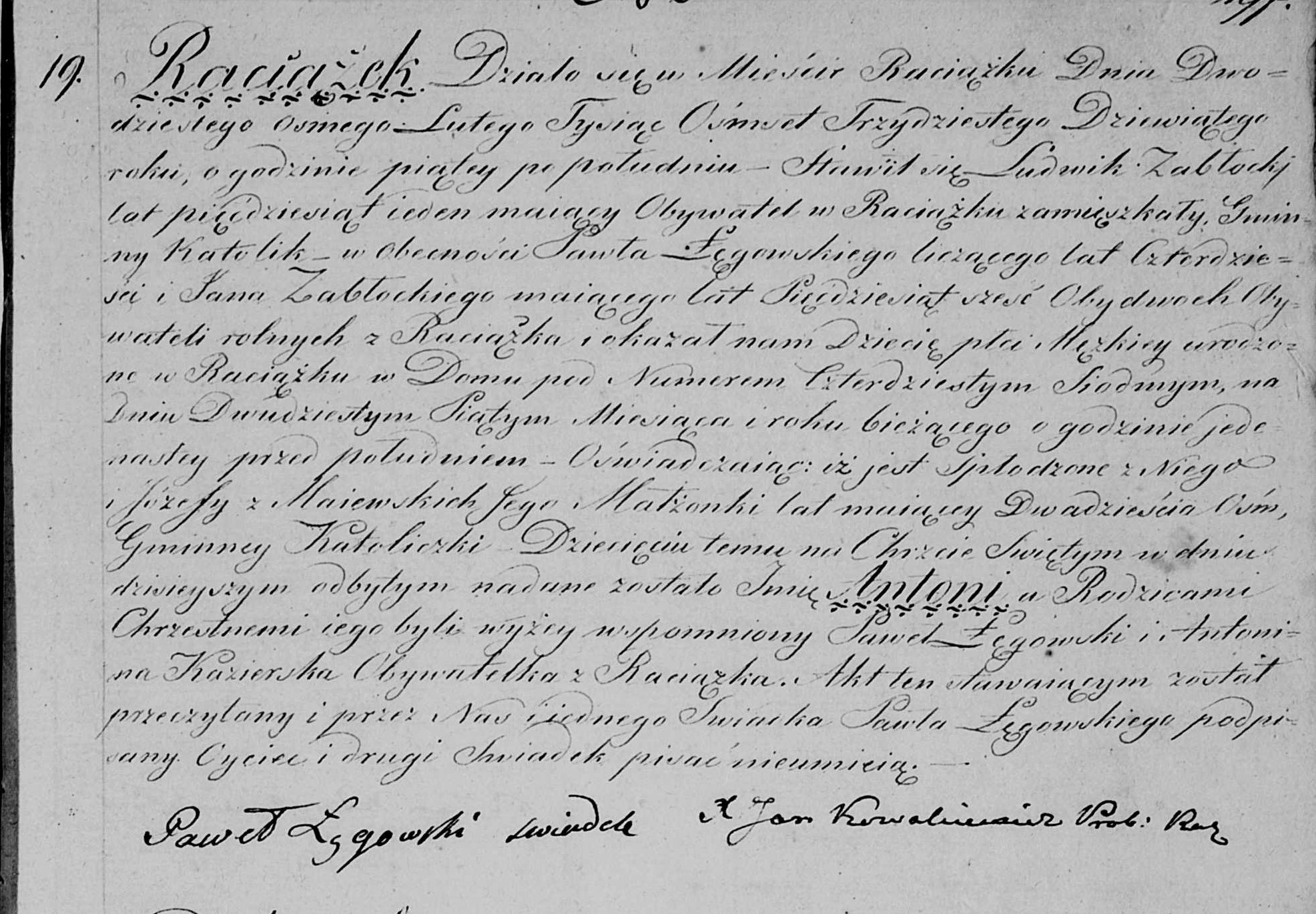 Es geschah in der Stadt Raciażek am achtundzwanzigsten Februar des Jahres Tausendachthundertneununddreißig um fünf Uhr nachmittags. Erschienen ist Ludwik Zabłocki, fünfundfünfzig Jahre alt und ansässiger Bürger in Raciażek, Gemeindekatholik, in Anwesenheit von Paweł Łęgowski, vierzig Jahre alt, und Stan Zabłocki, sechsundfünfzig Jahre alt, beide Bauernbürger aus Kasiążko. Sie zeigten uns ein männliches Kind, geboren in Raciążek im Haus mit der Nummer Siebenundvierzig am fünfundzwanzigsten Tag des aktuellen Monats und Jahres um elf Uhr vormittags. Sie erklärten, dass es von ihm und seiner Ehefrau Józefa geb. Maiewska, achtundzwanzig Jahre alt, Gemeindekatholikin, gezeugt wurde. Dieses Kind erhielt bei der Taufe, die am zwanzigsten Tag dieses Monats stattfand, den Namen Antoni. Die Eltern und Taufpaten waren der bereits erwähnte Pawel Łęgowski und Antonina Kazierska, eine Bürgerin von Raciązko.