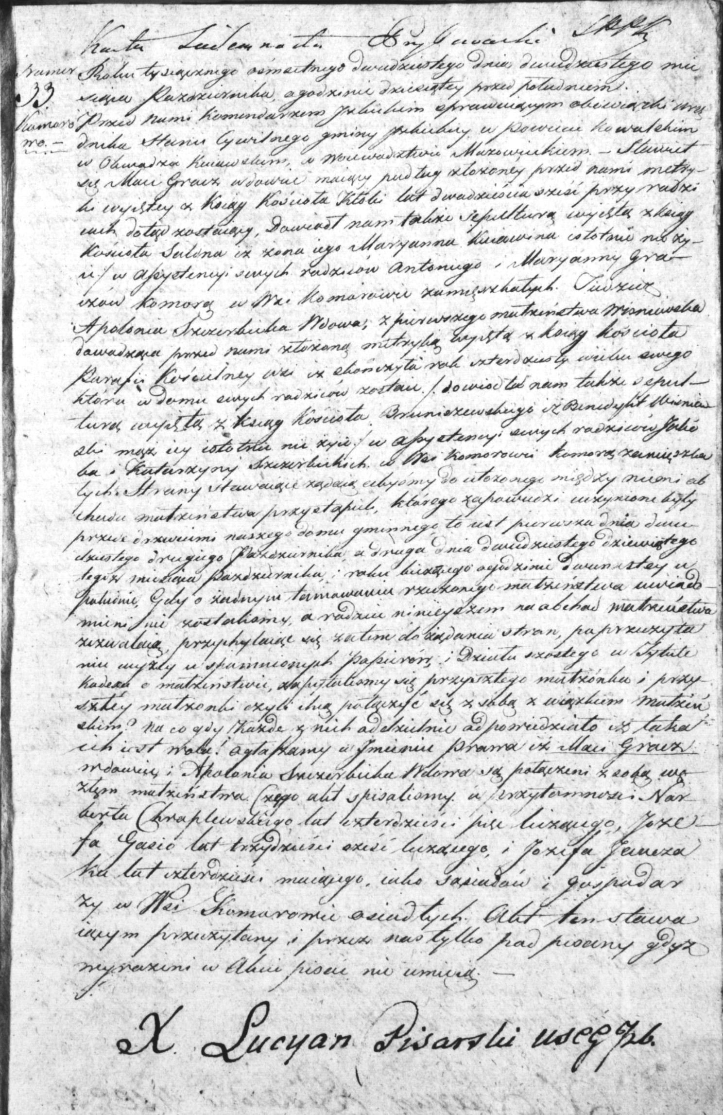 w Obwadza Kuiawskim w Woiewodztwie Mazowieckiem- Stawiełsię Masi Gracz wdowcuc maiący pudług złożoney przed nami metry-ki wysętey z Ksiąg Koscioła Któki lat dwadzieścia sześć przy radzicach dotąd zostaiący, Dowiadł nam także Sepilturą wyiętą z ksiąg Kosciota Salona iż żona iego Maryanna Kuiawina iototnie ni żyu w Assystencyi swych radziców antonego i Maryanny Graczów komorą w Wsi Komorowie zamieszkałych Judzier Apolonia Szerbicka Wdowa, z pierwszego małżeństwa Winiewska dowadząca przed nami złożoną metryką Więtą z Ksiąg Kościota Parafii Kościelney wsi iz zkończyła rak czterdziscy wieku swegoktóre w domu swych rodziców zostau/ dowiedla nam także sspulturą wysęłą z kesiąg Kościoła Bruniczewskiego iż Benedykt Wiśniaski mąż iey istotrue nie zyie w assystencyi swych rodziców Jakoba i Katurzyny Szczerbickich w Wsi komorowie komorą zamięszkałych Strany stawaiące żądaią cbyśmy do utożonego między niemi abchudu małżeństwa przystąpieli, którego zapowiecz uczynione byłyprzecz orzwciemi naszego domu gminnego to ist pierwsza dnia dwudziestego drugiego Paźoziernika, a druga dnia dwudziestego dziewiątegotegoż miesiąca Pazdziernika i roku bieżącego o godzinie owanstey wpobiśnie Gdy o żadnym tamowaniu rzeczonego małżeństwa uwiadomienine zostaliśmy a rodziec ninieyszem na obchad matżeństwazezwalaią przychylaiąc się zatem dożiądaniu stran, po przeczytaniu wyżey w spaminionych papurów, i Działu szóstego w Tylulekadeka i małżeństwie, zapytuliśmy się przysztego małżonka i przysztey małżonki czyli ccą połączyć się z sobą z wiązkiem małżeńskim na co gdy każo z nich addzielnie odpowiedziało iż takaich iest wola ogłaszamy w Imieniu prawa iż Masi Graczwdowiec i Akolonia Szezerbicka Wdowa są połączeni z sobą węzłym małżeństwa Czego Akt spisaliśmy w przytomności Starberta Kraplewskiego lat Czterdzieści pięć liczącego, Jozefa Gasio lat trzydzieści sześć liczącego, i Józefa Janczaka lat czterdzieści maiącego, iako Sasadów i Gospadarzy w Wsi Komarowie osidłych. Akt ten stawaiącym przeczytany i przez nas tylko pod pisany gdyż